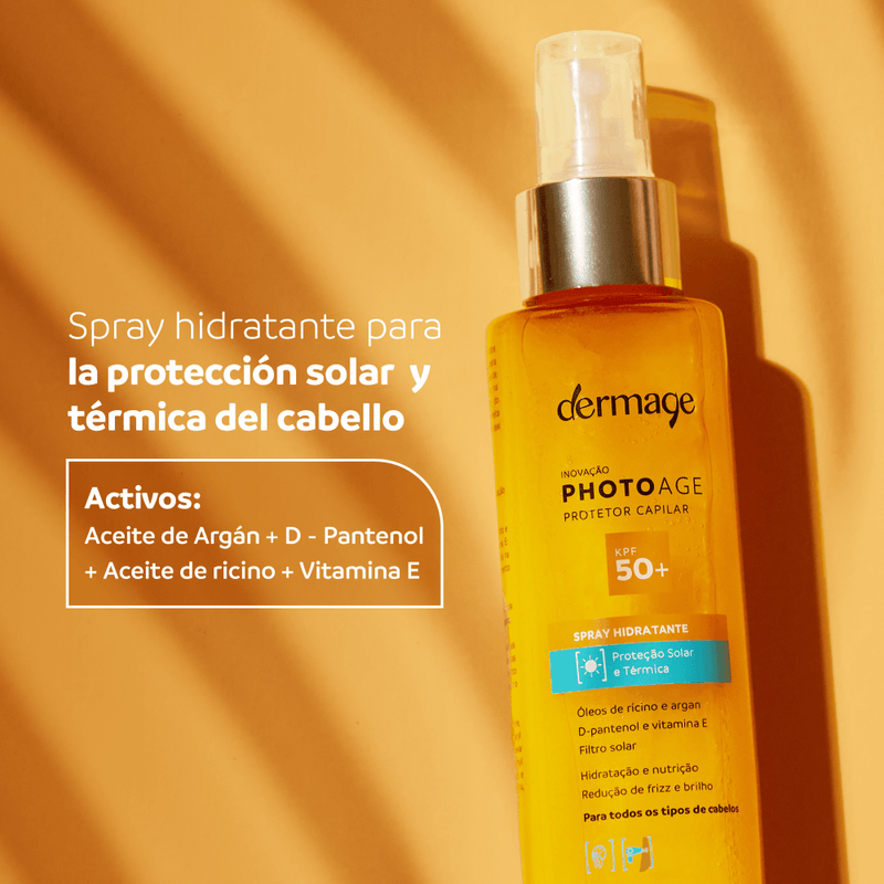 Photoage Protector Capilar KPF 50+ es un spray ligero que crea una película protectora alrededor de las fibras capilares, garantizando su integridad incluso cuando están expuestas al calor, ya sea solar o térmico (secador, plancha y rizador). Contiene una combinación única de ingredientes activos que ayudan a hidratar y nutrir el cabello, además de aportar brillo, suavidad, reducir el encrespamiento y prevenir la pérdida de color.